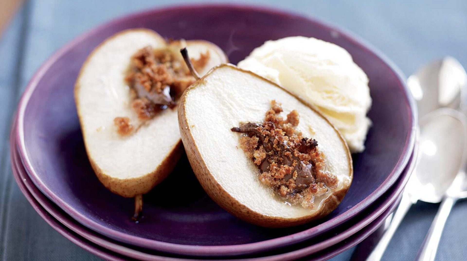 - Σερβίρουμε δύο κομμάτια αχλαδιού σε κάθε μερίδα, με μία μικρή μπάλα παγωτού.