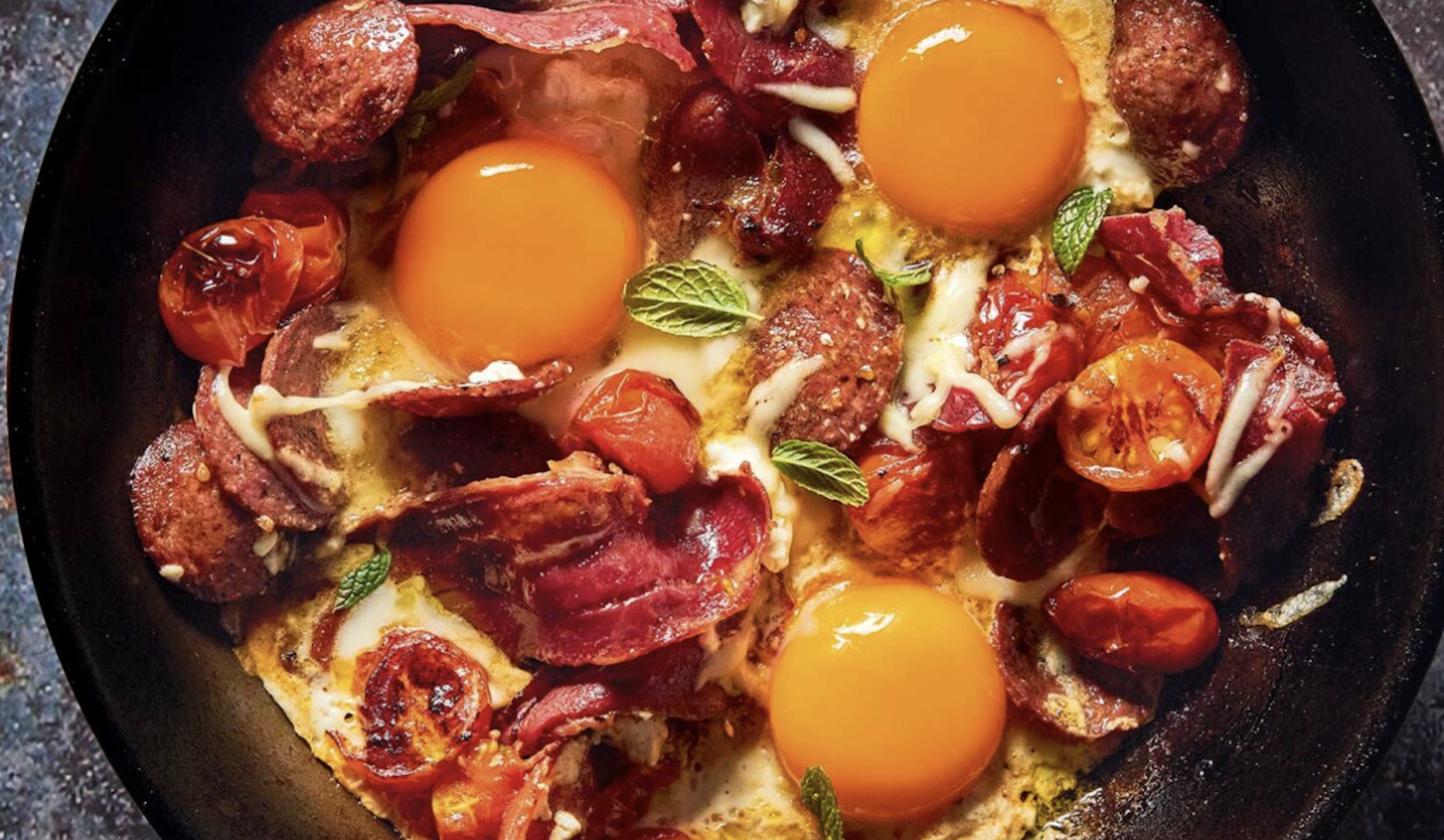 Έχει όλα όσα αναγράφονται στον τίτλο, σουτζούκι, παστουρμά, κασέρι, αυγά και ακόμα περισσότερα, όπως μαλακή φέτα, αρωματικό δυόσμο και γλυκόξινα ντοματίνια. Τι άλλο να ζητήσουμε από μια λιχούδικη, αποκριάτικη τηγανιά;