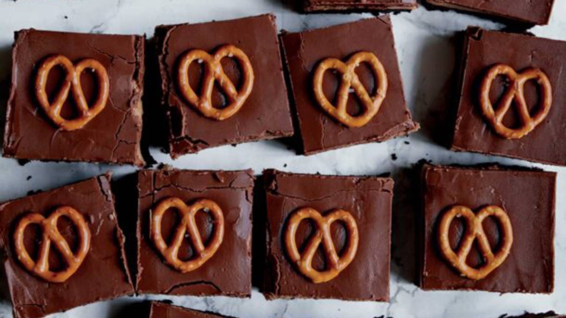 - Απλώνουμε το γλάσο της σοκολάτας πάνω στο μείγμα φυστικοβούτυρου και από πάνω βάζουμε τα πρέτσελ, υπολογίζοντας να έχουμε ένα πρέτσελ σε κάθε κομμάτι μπράουνι.