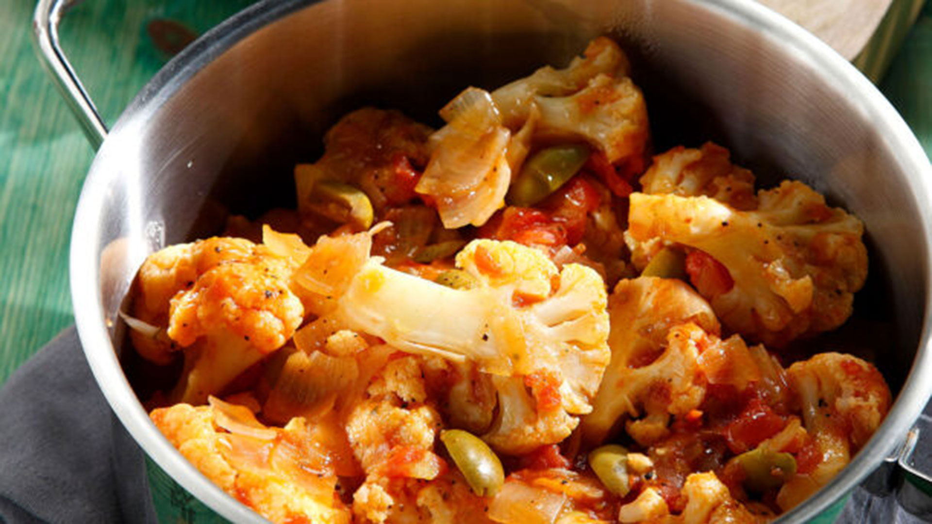 Το κουνουπίδι στα καλύτερά του! Γιαχνιστό με μπαχάρια, ντοματένια σάλτσα, πράσινες ελιές και μια πικάντικη σκληρή φέτα. Συνοδέψτε το με παξιμάδια κριθαρένια ή ζεστές πίτες για σουβλάκι.
