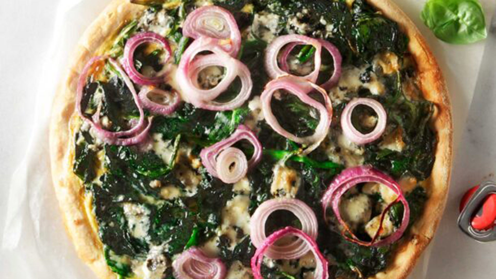 - Ακουμπάμε τη βάση της πίτσας σε ένα μεγάλο κομμάτι χαρτί ψησίματος και απλώνουμε στην επιφάνειά της το μείγμα σπανακιού.
