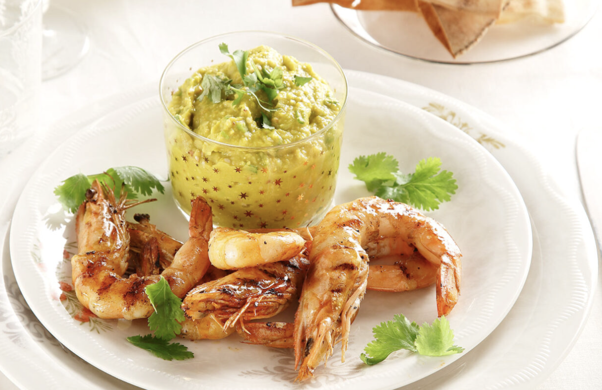 - Σερβίρουμε τις γαρίδες με το ντιπ και τα τραγανά τσιπς αραβικής πίτας.