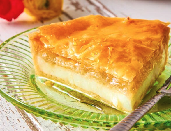 - Με ένα κοφτερό μαχαίρι κόβουμε το γαλακτομπούρεκο σε 6 ή 8 κομμάτια, σαν πίτσα.