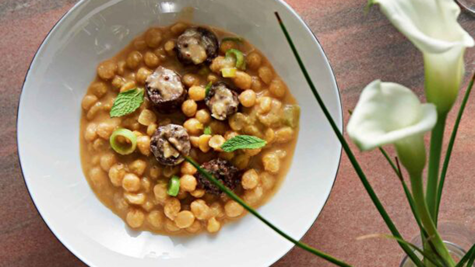 - Χτυπάμε στον πολυκόφτη 1/2 κουτάλα της σούπας από τη ρεβυθάδα, μαζί με το ελαιόλαδο, τον δυόσμο και τον χυμό λεμονιού και αδειάζουμε το μείγμα στα ρεβύθια.