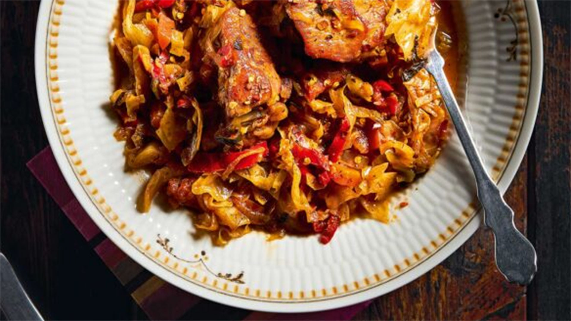 - Τα μαγειρεύουμε για 2-3 λεπτά, μέχρι να πέσει κάπως ο όγκος του λάχανου, και ρίχνουμε 300 ml ζεστό νερό, τη σάλτσα ντομάτας, την πάπρικα, τη ρίγανη, το σέλινο, αλάτι και πιπέρι.