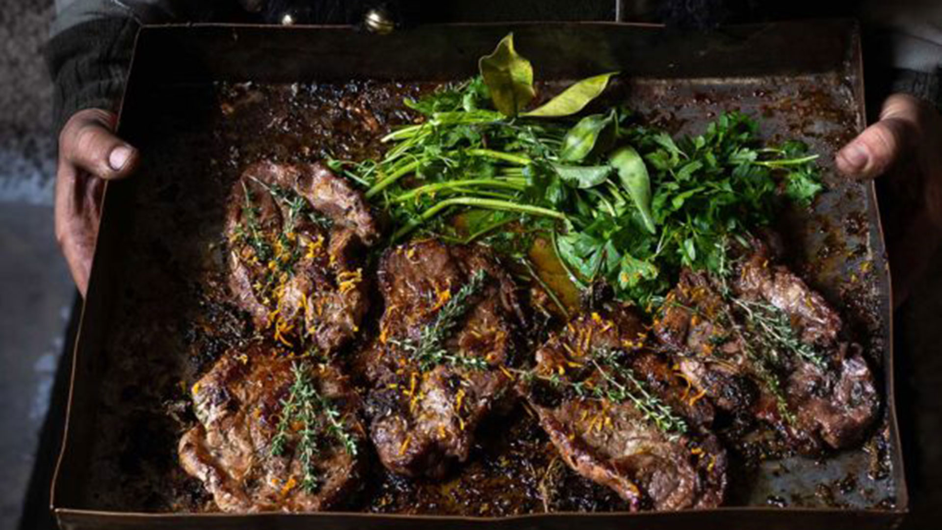 - Στρώνουμε με λαδόκολλα ένα μεγάλο ταψί και αραδιάζουμε τις μπριζόλες σε μονή στρώση, χωρίς να τις σκουπίσουμε από τη μαρινάδα.