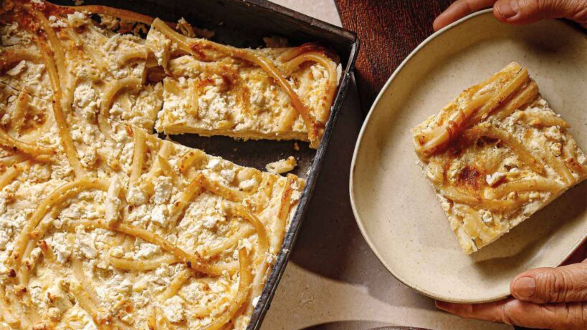 Υπάρχει συχνά μια παρεξήγηση για τις μακαρονόπιτες και πιστεύεται πως είναι πίτες με φύλλα και γέμιση με ζυμαρικά, συνδυασμός που είναι λογικό να θεωρείται βαρύς και αταίριαστος. Στην πραγματικότητα, η μακαρονόπιτα στην Αχαΐα είναι ένα πλούσιο αλλά ωραιότατο φαγητό με μακαρόνια, τυριά, γάλα και βούτυρο, ψημένα όλα μαζί σε ταψί, χωρίς φύλλα φυσικά, ένα είδος παστίτσιου χωρίς κιμά. Στην Αιγιάλεια, όπου είναι βρισκούμενα άφθονα τα έξοχα τυροκομικά αιγοπρόβεια προϊόντα του Χελμού, η μακαρονόπιτα φτιάχνεται με ντόπια τυριά, πρόβειο γάλα και αυγά, και είναι ένα πλούσιο φαγητό, ό,τι πρέπει για τις ημέρες της Τυρινής. Οι αναλογίες που μας δίνει ο βραβευμένος με αστέρι Michelin σεφ Γιώργος Φελεμέγκας είναι τέλεια υπολογισμένες για μια μακαρονόπιτα με λαχταριστή υφή και πλούσια αρώματα. Παραδοσιακά χρησιμοποιείται φορμαέλα Αραγονίας, αλλά είναι δυσεύρετο τυρί, γι’ αυτό το αντικαθιστούμε με μια πικάντικη γραβιέρα.
