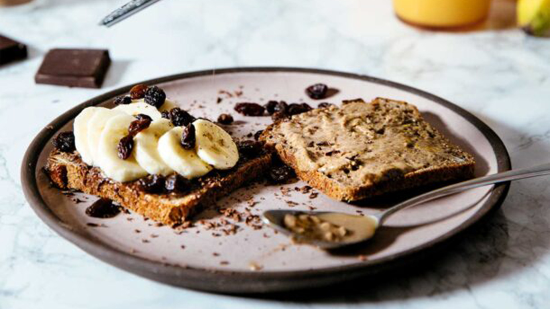 - Πασπαλίζουμε τις 2 από τις 4 φέτες με 20 γρ. τριμμένη σοκολάτα υγείας την καθεμία, απλώνουμε επάνω από μισή μπανάνα κομμένη σε φέτες και από 1 κουτ. γλυκού σταφίδες.