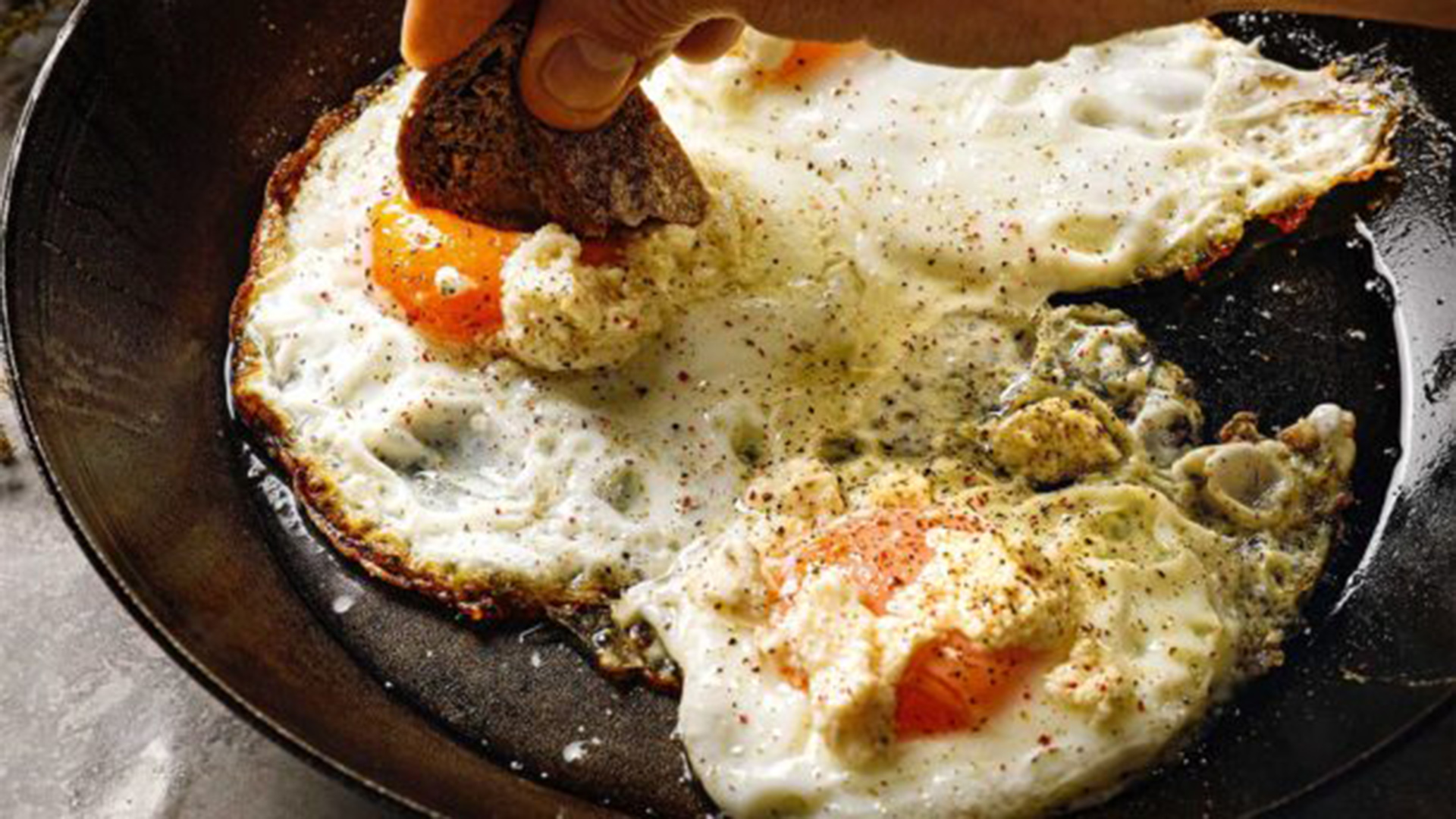 - Με ένα κουτάλι βρέχουμε τους κρόκους με βούτυρο που ολοένα και αυξάνεται στο τηγάνι καθώς λιώνει η στάκα, μέχρι να εμφανίσουν μια λευκή μεμβράνη και τα ασπράδια να σφίξουν. Αν χρειάζεται, σκεπάζουμε το τηγάνι με καπάκι.
