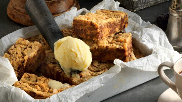- Σερβίρουμε τα μπράουνις με σοκολάτα και φυστικοβούτυρο με παγωτό και σος καραμέλας.