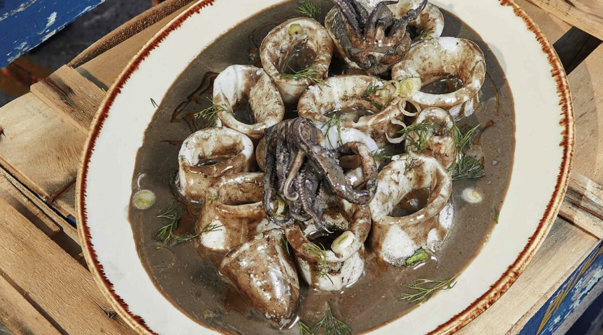 Αυτά τα καλαμάρια μαγειρεύονται στο μελάνι τους! Στο τέλος, ρίχνουμε ψωμί στα ζουμιά της κατσαρόλας και πολτοποιούμε φτιάχνοντας μια πυκνή σάλτσα απίθανης νοστιμιάς.