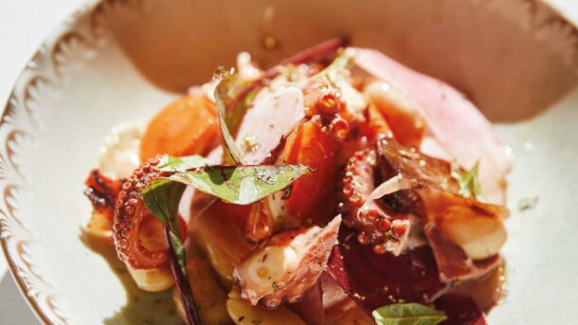 Μια σύγχρονη εκδοχή του ξιδάτου χταποδιού, με φασόλια πιάζ και ωμές ρίζες. Μεζές από τους λίγους!