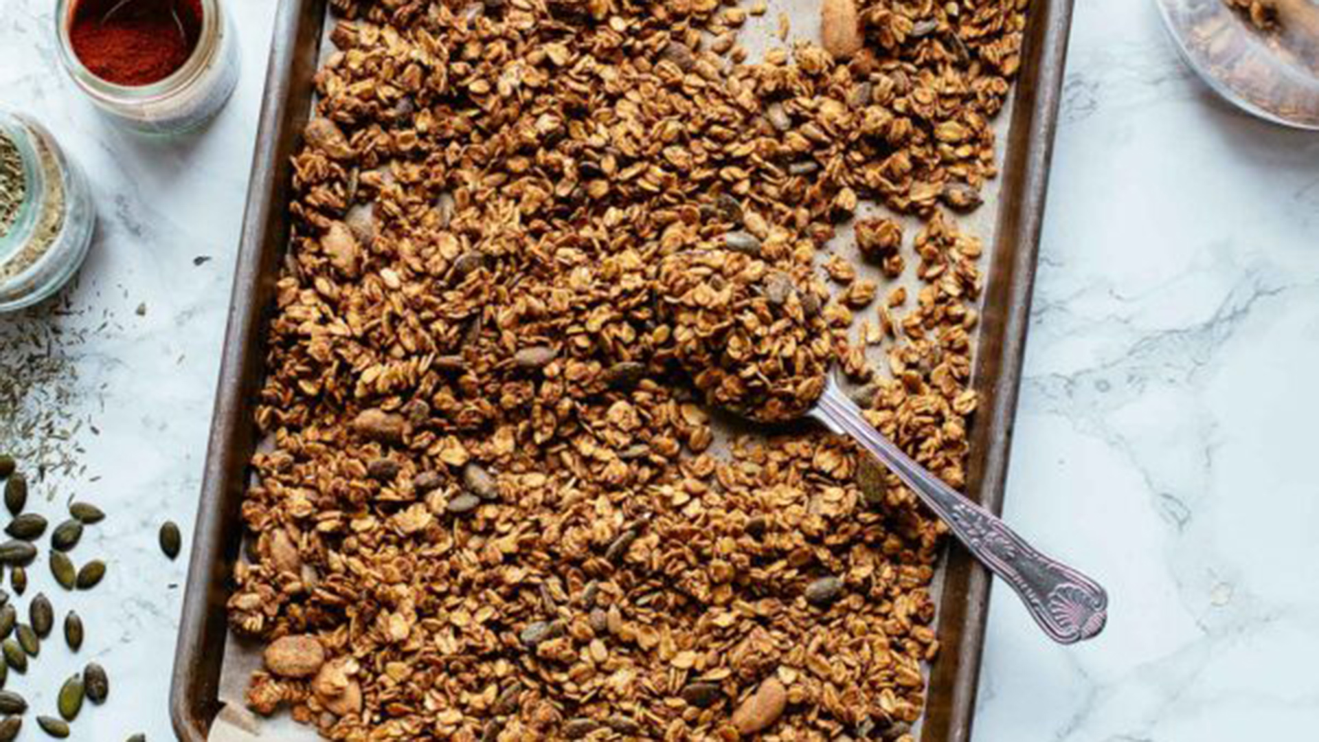 - Για να φτιάξουμε την αλμυρή γκρανόλα, ξεκινάμε βάζοντας σε ένα μπολ το φυστικοβούτυρο, το νερό, το ξύσμα και τον χυμό λεμονιού, την πάπρικα, το θυμάρι, το λάδι και αλατοπίπερο.
