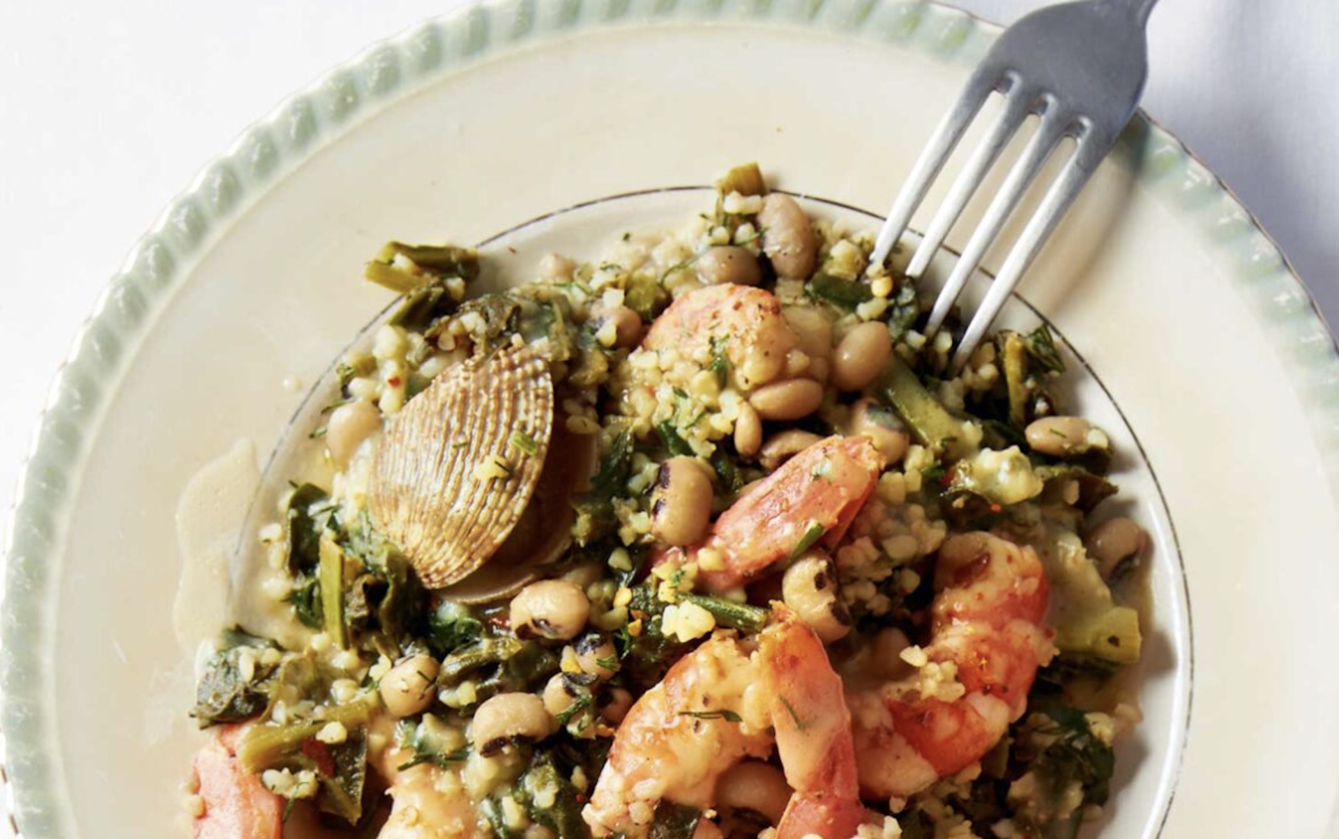 Ο καντουμάς είναι ποντιακό φαγητό με φασόλια και σιτάρι μαγειρεμένα στην κατσαρόλα, που σερβίρονται με ένα τσιγαριαστό υλικό από πάνω, συνήθως κρεμμύδι. Εδώ η σεφ επιλέγει να τσιγαρίσει τα εποχικά σέσκουλα και να συνδυάσει το φαγητό με γαρίδες.