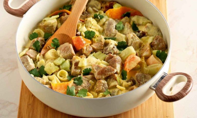 - Εν τω μεταξύ, σε ένα βαθύ μπολ ανακατεύουμε με το σύρμα το γιαούρτι με το κορν φλάουρ, το κάρι, τον κουρκουμά, το χυμό λεμονιού και το πιπέρι καγιέν και περιχύνουμε με το μείγμα το χοιρινό με τα πράσα.