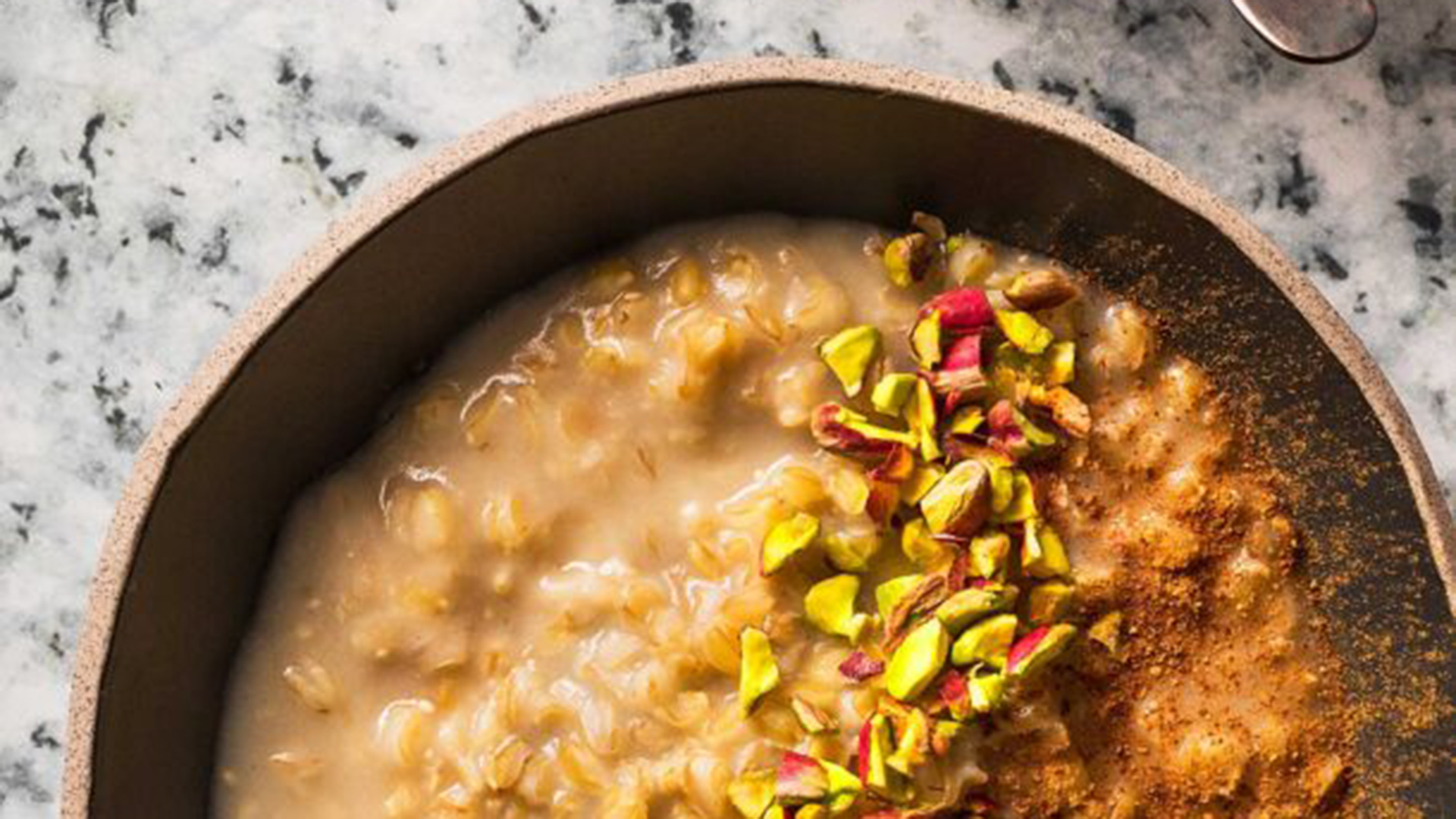 Μοιράζουμε σε μπολ και γαρνίρουμε με φιστίκια, πετιμέζι, ρόδι και κανέλα.