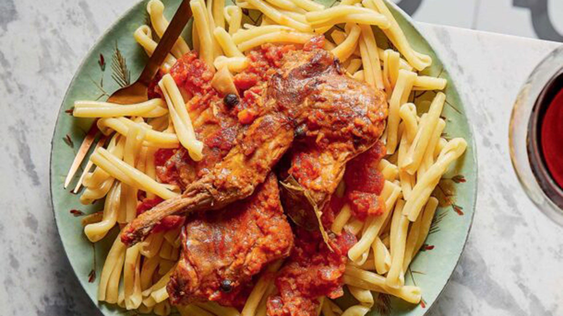 - Από πάνω τακτοποιούμε το κουνέλι και περιχύνουμε με την υπόλοιπη σάλτσα της κατσαρόλας.