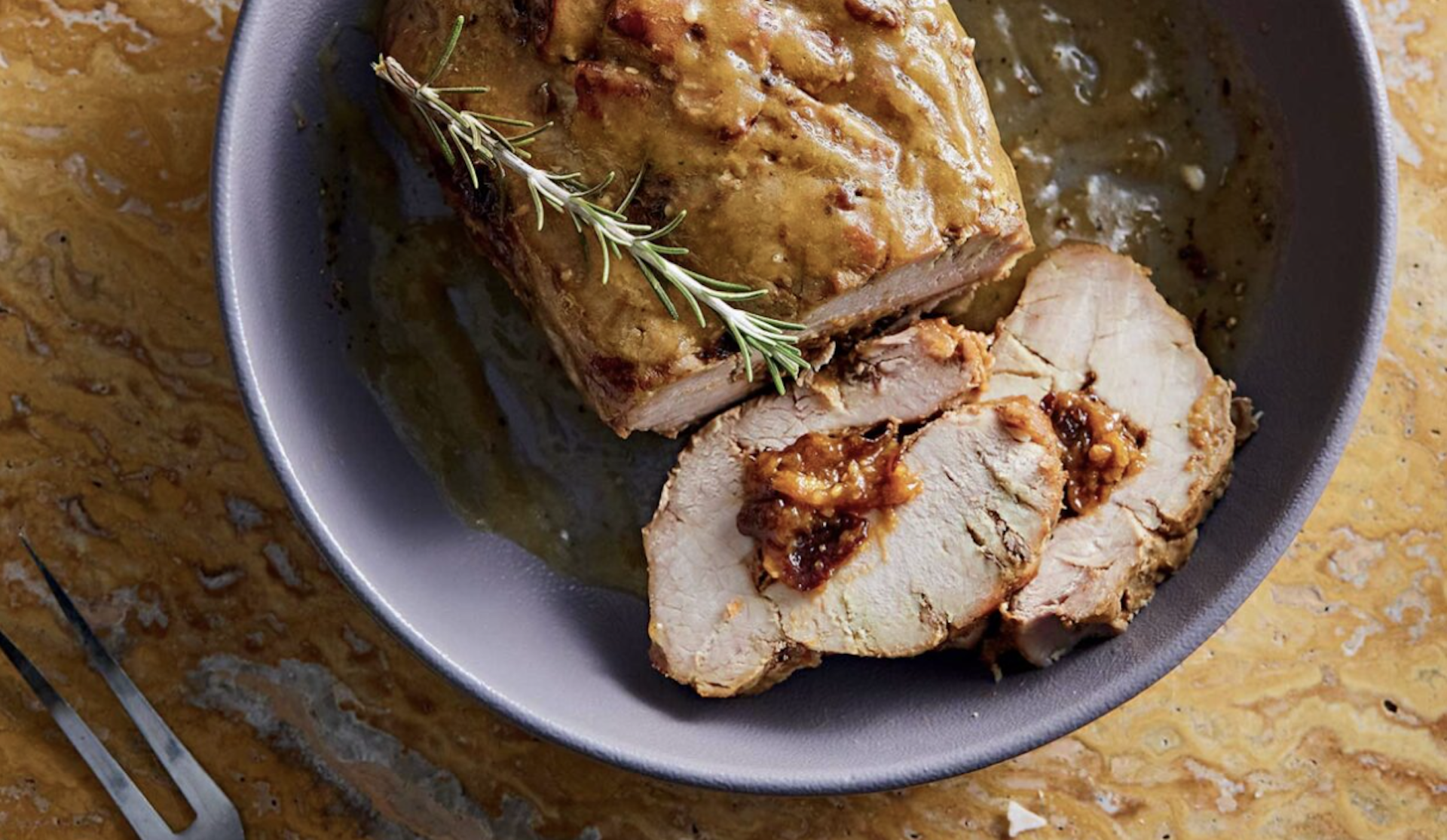 Το ψητό χοιρινό είναι πάντα ευπρόσδεκτο σε ένα τραπέζι. Εδώ το κάνουμε ρολό, γεμιστό με μια πλούσια κρέμα με δαμάσκηνα και εσπεριδοειδή. Με ένα αφράτο πιλάφι στο πλάι του είναι χάρμα.