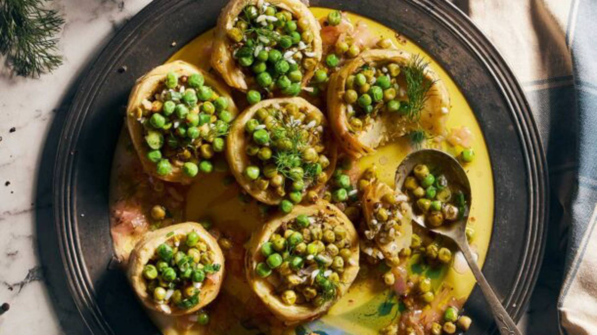Οι τρυφερές αγκινάρες της εποχής και μια πράσινη, γέμιση με ρύζι, αρακά και μυρωδικά σε ένα θαυμάσιο πιάτο με τη γεύση της άνοιξης.