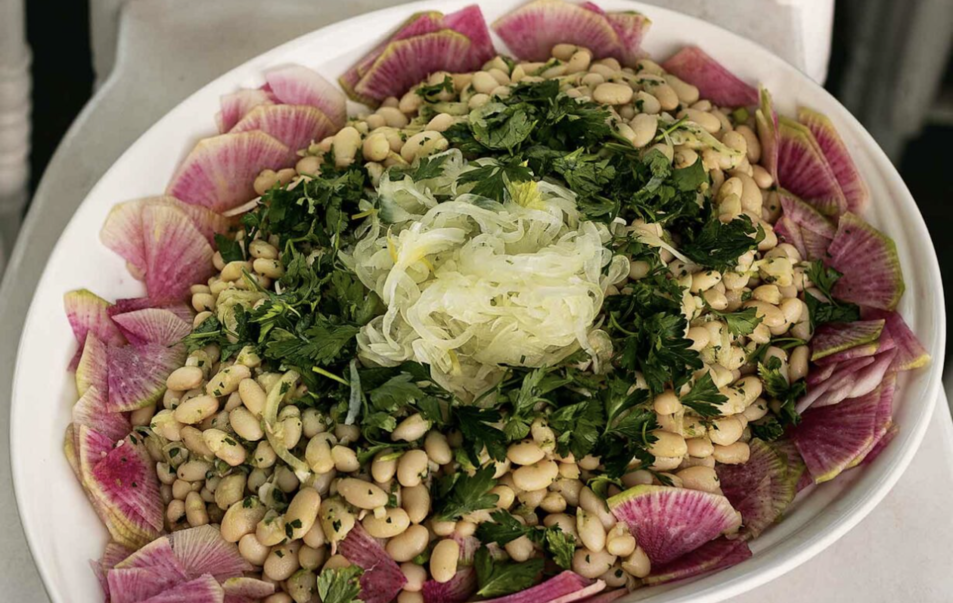 Η Λωξάνδρα Μαής εμπλουτίζει τη βινεγκρέτ της με μαϊντανό και δίνει μια έξτρα εορταστική νότα, όπως και στο στόλισμα της πιατέλας με τα δημοφιλή ροζ ραπανάκια της Πόλης. Ο στολισμός βέβαια είναι προαιρετικός, αλλά υπέροχος.