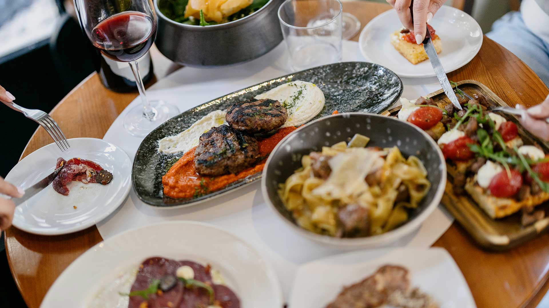 Τότε ανέλαβε δράση ο γνωστός σεφ Σωτήρης Ευαγγέλου, με καταγωγή από τον Τύρναβο, που η Βίκυ τον ήξερε από μικρή. «Ήρθε ο Σωτήρης και ξεκινήσαμε τις δοκιμές. Μαζί του αποφασίσαμε τα πιάτα», μας ενημερώνει. «Το βασικό μας μέλημα είναι η τοπικότητα. Αυτός που έρχεται να δοκιμάσει ωραίες και αυθεντικές γεύσεις από τη Λάρισα και τη Θεσσαλία», λέει, όσο στο τραπέζι μας έρχονται τα πρώτα πιάτα: το καρπάτσιο και η ταλιάτα βίσονα. Δεν είχα ξαναφάει βίσονα και είχα τις επιφυλάξεις μου. Τελικά δοκίμασα και μπορώ να πω ότι μου άρεσε. Τι γεύση έχει; Το κρέας του μοιάζει με του μοσχαριού, μόνο που έχει πιο λεπτή γεύση και είναι αρκετά ελαφρύ. Όπως μας ενημέρωσε ο σεφ, πριν μαγειρευτεί μαρινάρεται με κρασί και δεν θέλει πολύ ώρα για να γίνει. Τον φτιάχνουν και σε άλλες εκδοχές: κοκκινιστό με σιουφιχτά, ταρτάρ και μπέργκερ. Τα κεφτεδάκια μαύρου χοίρου και η ποικιλία με τα δικά τους βιολογικά λουκάνικα ήταν πολύ νόστιμα, με βαθιά γεύση που μου έμεινε. Όπως επίσης, οι μπρουσκέτες με ψωμί που ζυμώνουν οι ίδιοι, τις οποίες σερβίρουν με δικό τους φρέσκο τυρί. Το μενού είναι σφιχτό, με λίγα πιάτα, που αλλάζουν από καιρό σε καιρό. «Έχουμε λίγα πράγματα, απλά, και τα κάνουμε όσο καλύτερα μπορούμε, αυτή είναι η φιλοσοφία μας», εξηγεί η Βίκυ.