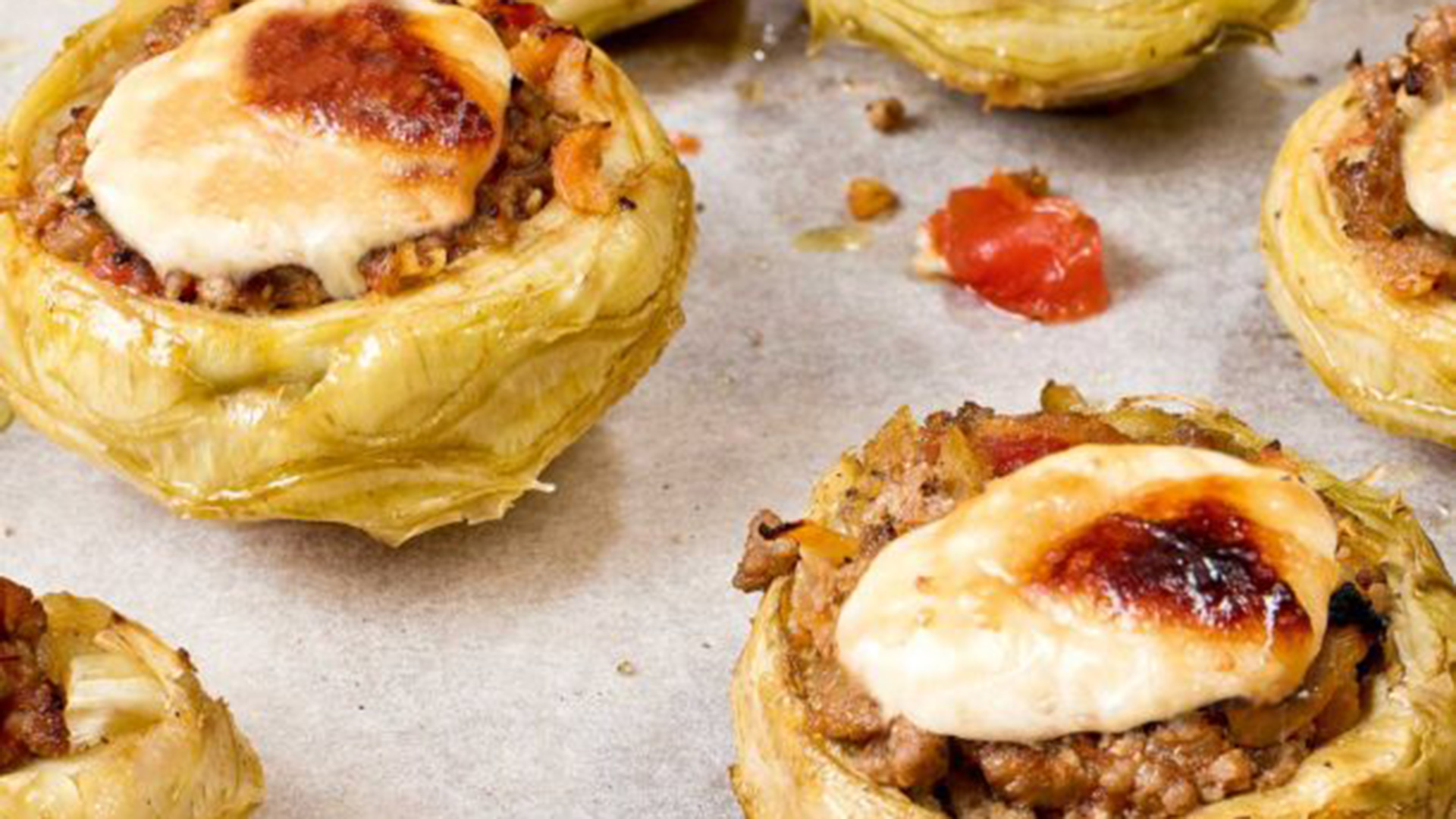 - Γεμίζουμε τις αγκινάρες με τον κιμά και τις βάζουμε στο ταψί σε μία στρώση.