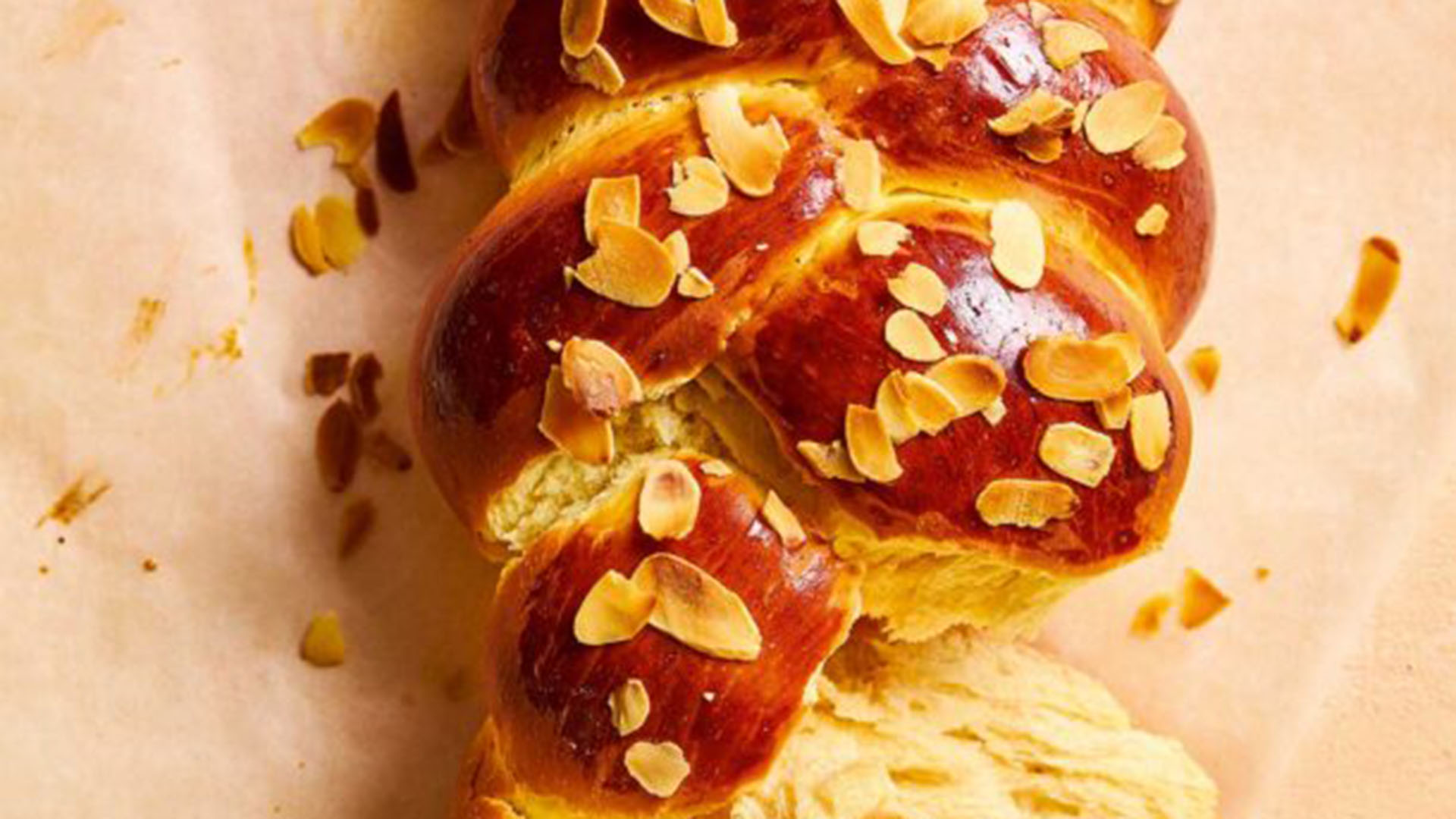 - Βάζουμε το τσουρέκι σε μια λαμαρίνα στρωμένη με λαδόκολλα. Αλείφουμε με τον κρόκο και πασπαλίζουμε με αμύγδαλο φιλέ.