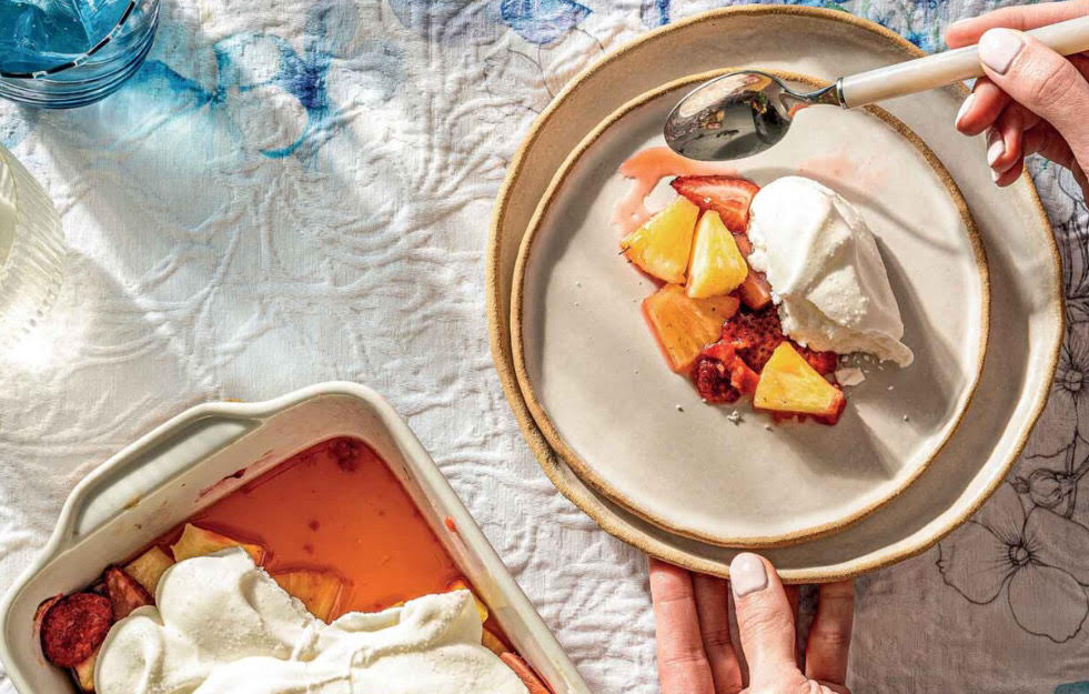 Αντί να ψήσουμε μια σκέτη βάση μαρέγκας, την οποία θα σερβίρουμε μετά με φρούτα και σαντιγί, βάζουμε να ψηθούν τα φρούτα δημιουργώντας από πάνω τους ένα «καπάκι» από μαρέγκα. Η μαρέγκα λειτουργεί σαν μόνωση και τα φρούτα ψήνονται, μαλακώνουν και γλυκαίνουν σαν κομπόστα.
