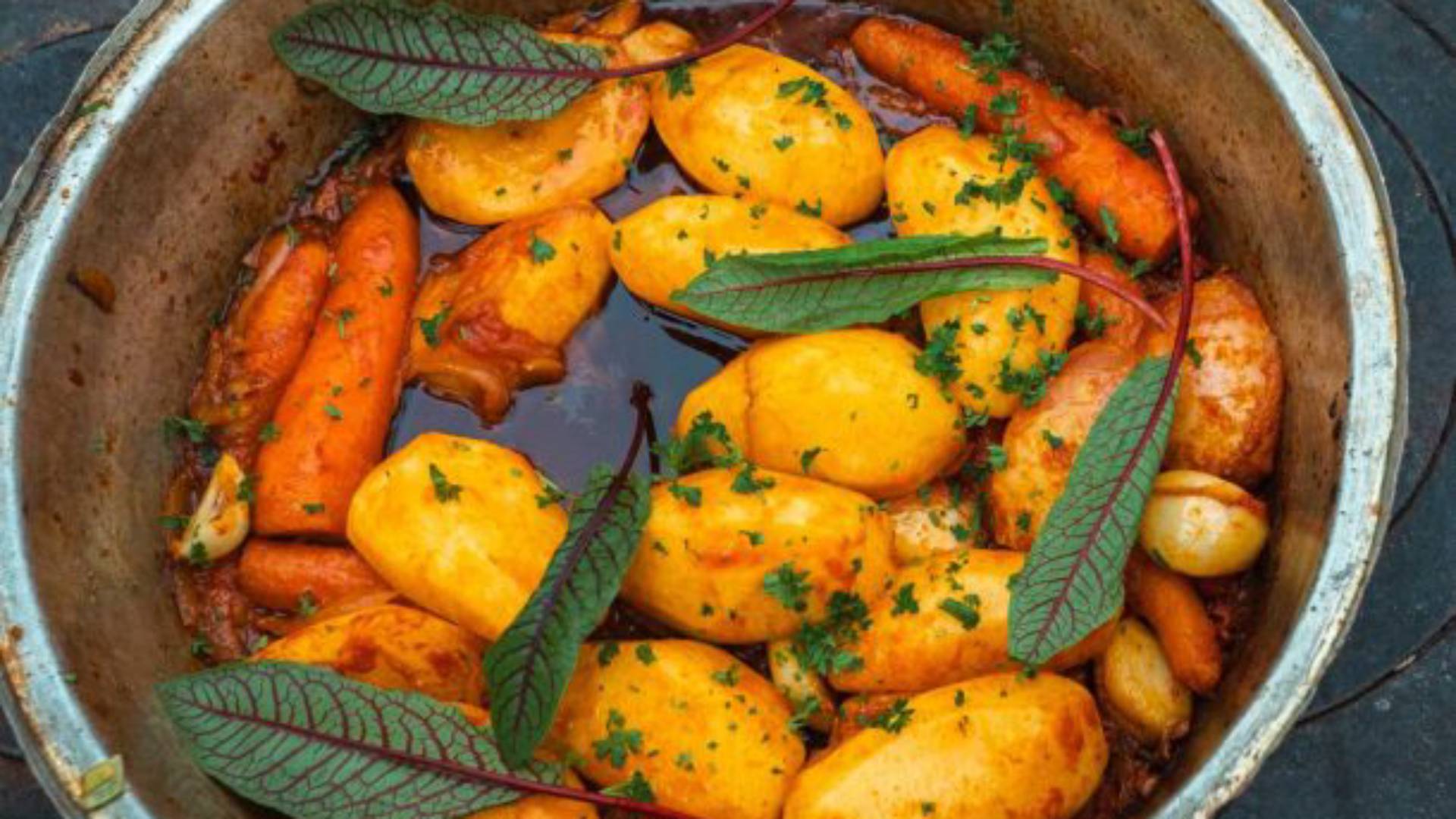 - Για να ετοιμάσουμε τις ανοιξιάτικες ρίζες γιαχνί σε μια φαρδιά και ρηχή κατσαρόλα ζεσταίνουμε το ελαιόλαδο σε μέτρια φωτιά και ρίχνουμε τις πατάτες, τις ρέβες, τα καρότα και το κρεμμύδι.