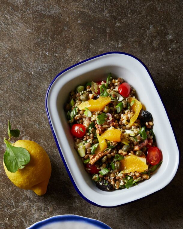 - Για να ετοιμάσουμε τις φακές σαλάτα με πλιγούρι, κάππαρη, πορτοκάλι και καρύδια, πρώτα ξεπλένουμε τις φακές, τις βάζουμε σε μια μικρή κατσαρόλα με 900 ml νερό, τη δάφνη και τα σκόρδα και βράζουμε σε μέτρια φωτιά για περίπου 30 λεπτά, μέχρι να μαλακώσουν αλλά να μη λιώσουν.