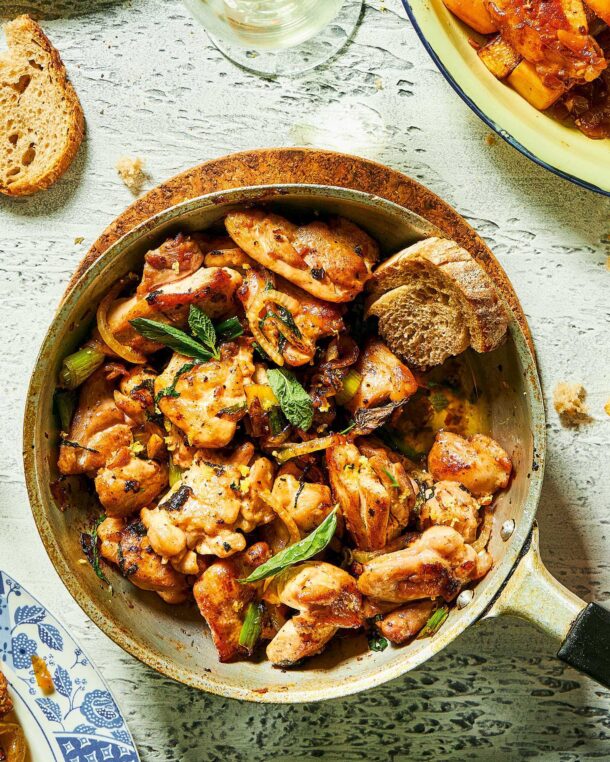 - Βάζουμε ξανά όλη την ποσότητα του κοτόπουλου ξανά στο σκεύος, σβήνουμε με τον χυμό λάιμ, ρίχνουμε τα υπόλοιπα φύλλα δυόσμου και μαγειρεύουμε για 3-5 λεπτά ακόμα, μέχρι να γίνει το κοτόπουλο (κόβουμε ένα κομμάτι: πρέπει να δείχνει λευκό και ζουμερό, χωρίς ροζέ σημεία, αλλιώς μαγειρεύουμε για 1-2 λεπτά ακόμα).