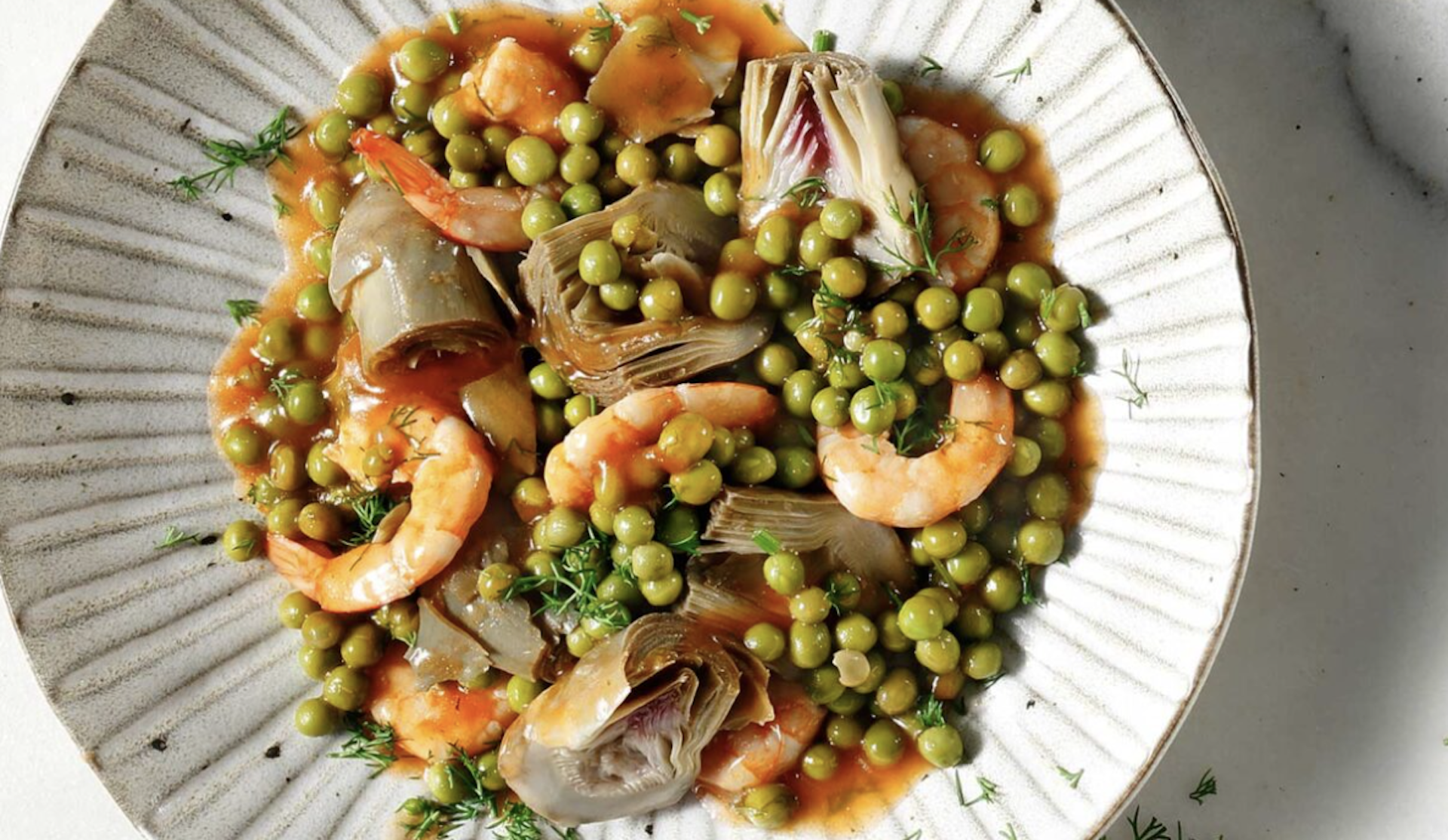 Αγκινάρες, αρακάς και γαρίδες ένα σε ένα μαγειρευτό τρυφερό και μυρωδάτο, με τη γεύση της άνοιξης, που δένει στεριά και θάλασσα.