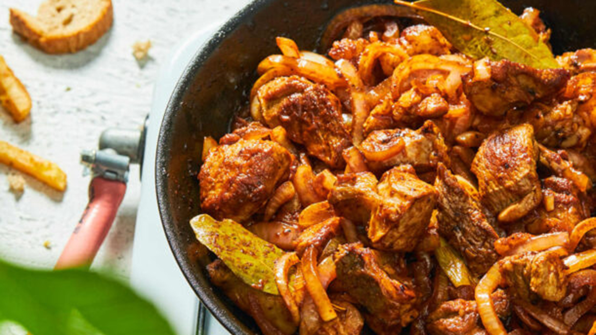 - Προσθέτουμε τον πελτέ, τη δάφνη και αλατοπίπερο, χαμηλώνουμε τη φωτιά και μαγειρεύουμε μέχρι το φαγητό να απορροφήσει τα υγρά του και να μείνει η τηγανιά με το λάδι της.
