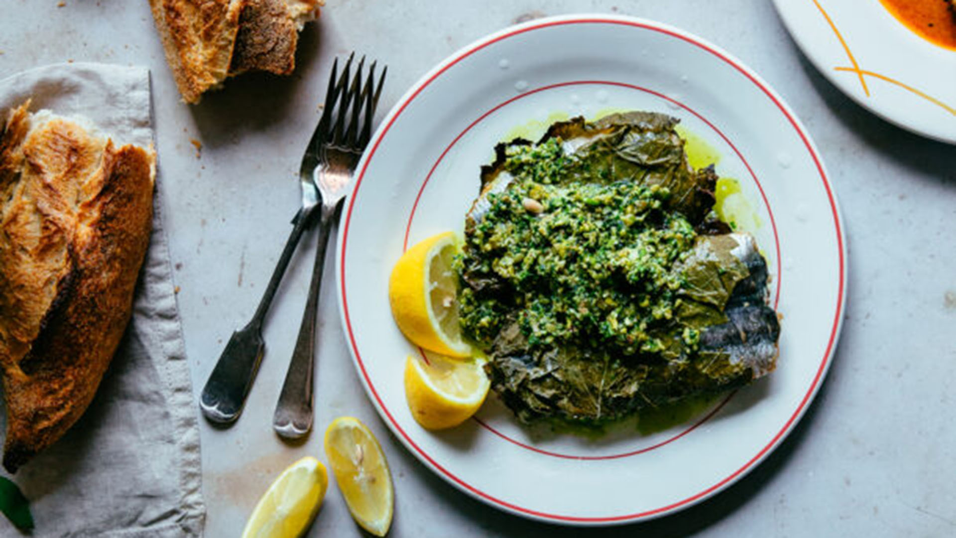 - Τυλίγουμε την καθεμία με ένα αμπελόφυλλο, αφήνοντας έξω μόνο την ουρίτσα κάθε ψαριού, και λαδώνουμε ξανά.