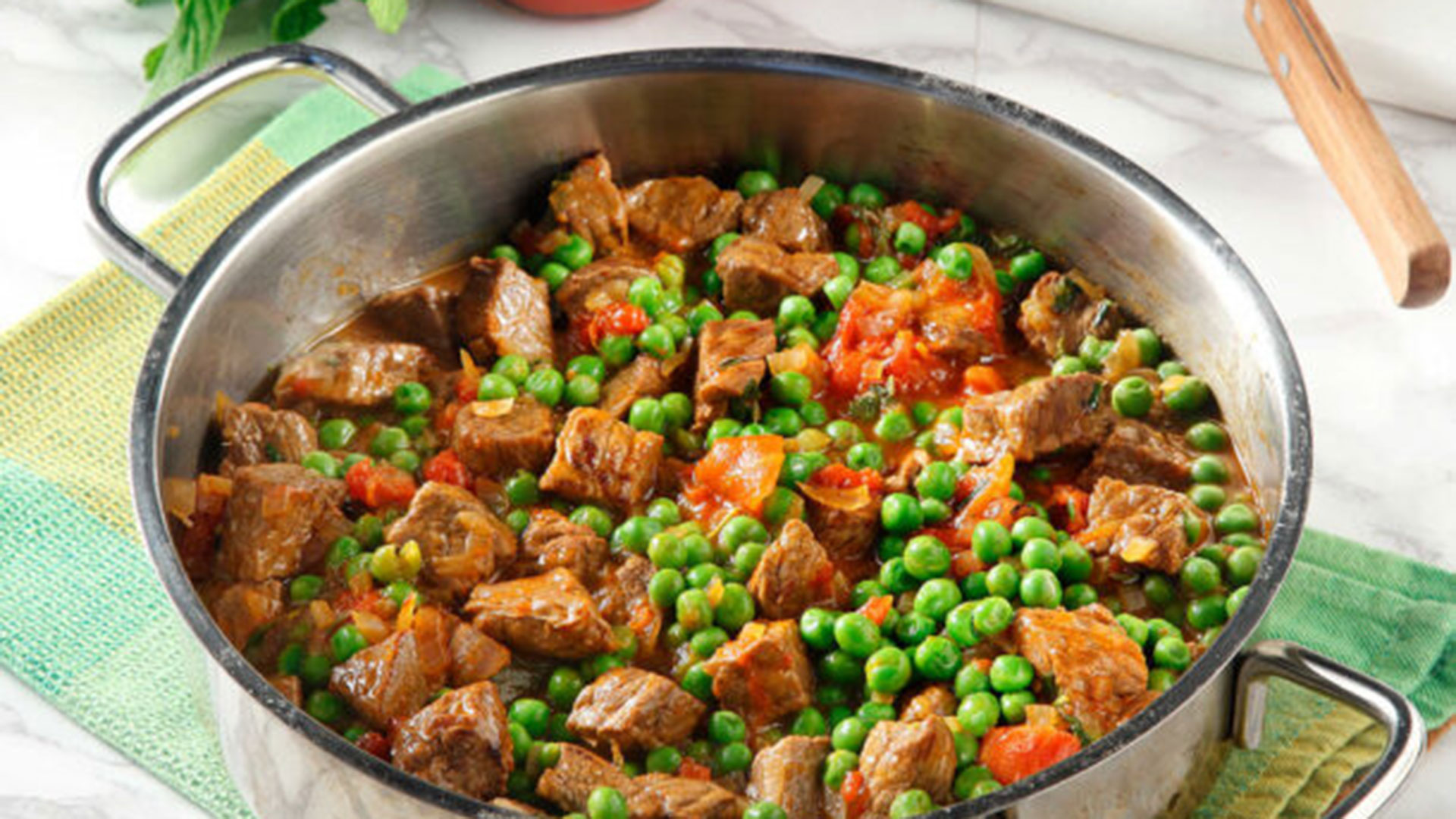 Λαχταριστό μοσχαράκι κοκκινιστό με καταπράσινο αρακά και αρωματικό δυόσμο, ένα αγαπημένο φαγητό.