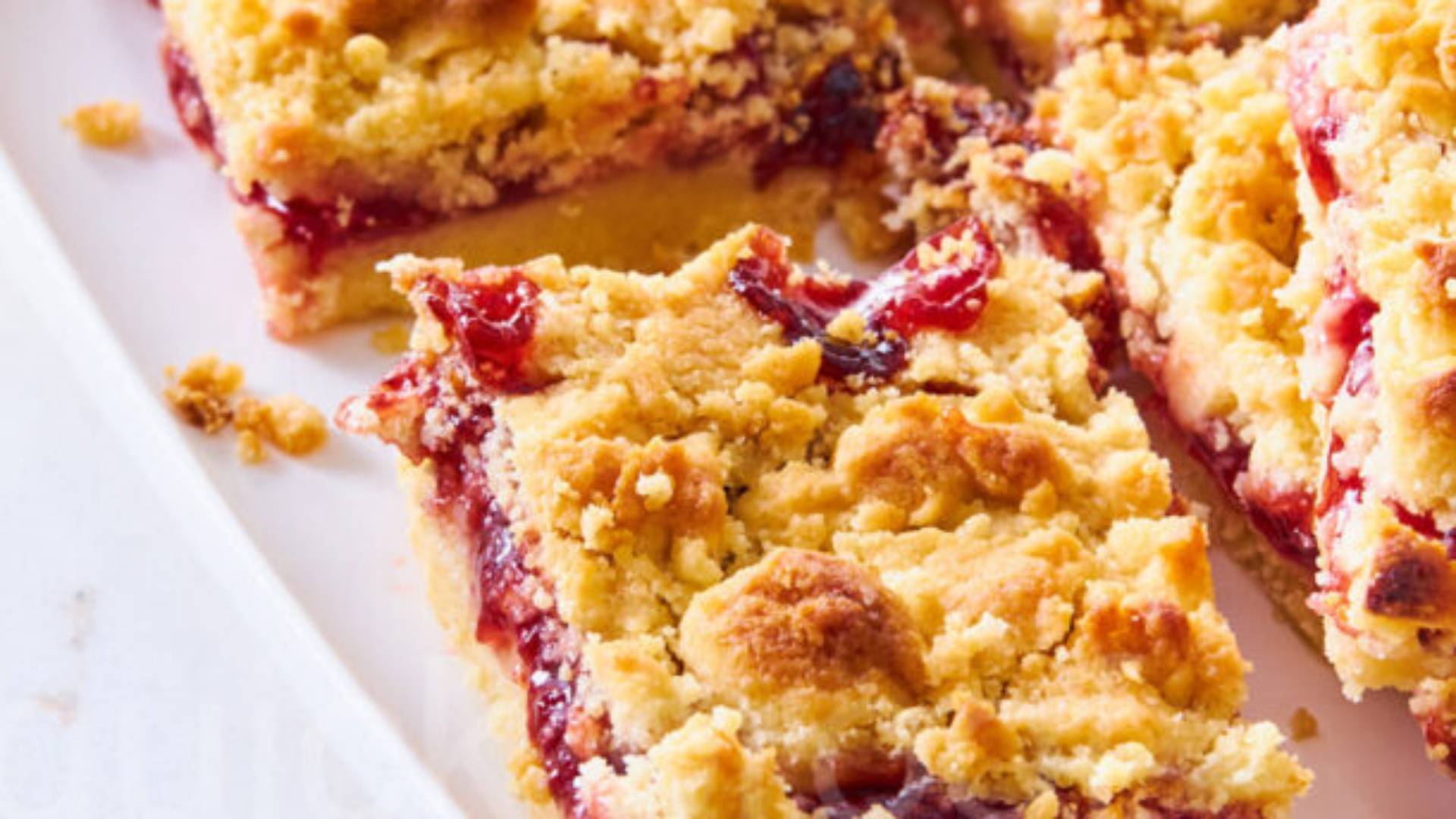 - Πιέζουμε το υπόλοιπο μείγμα κραμπλ στα χέρια μας, ώστε να ενωθεί σε ζυμάρι και το κόβουμε με τα χέρια μας σε ακανόνιστα μικρά κομμάτια που σκορπίζουμε πάνω από τη μαρμελάδα.