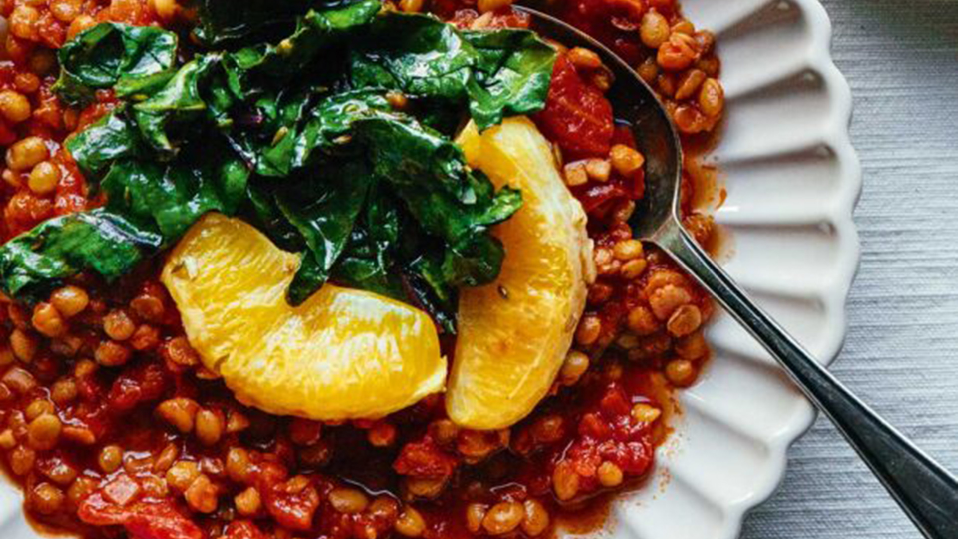 - Σερβίρουμε τις φακές σε βαθιά πιάτα και στο κέντρο κάθε μερίδας μοιράζουμε τα σέσκουλα, βάζοντας από 1-2 φέτες πορτοκαλιού σε κάθε μερίδα.