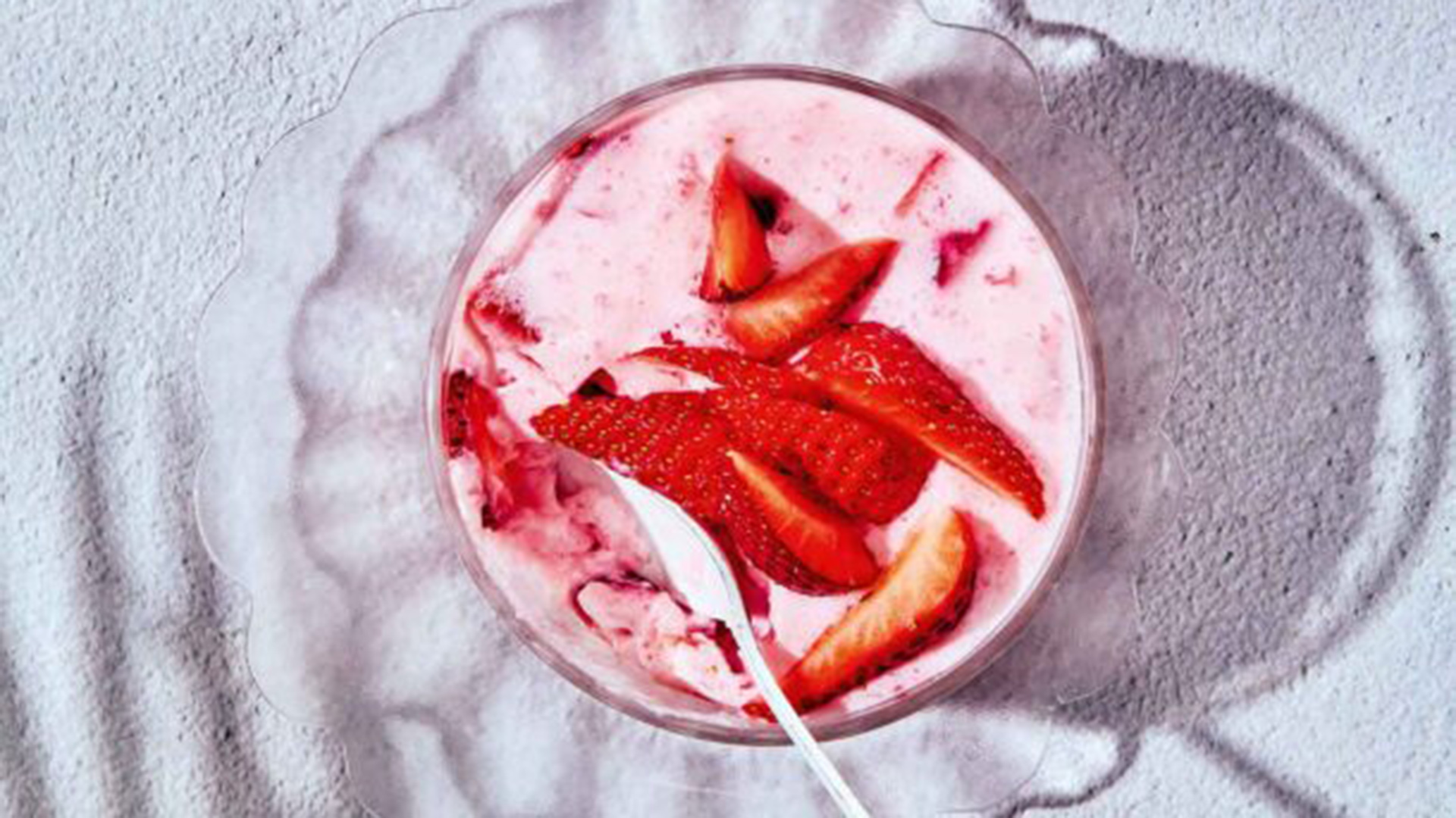 - Για το γιαουρτοζελέ, ξεκινάμε πολτοποιόντας στον πολυκόφτη 100 γρ. από τις φράουλες μαζί με τα 150 ml κρύο νερό. Σουρώνουμε το φραουλονερό και το κρατάμε στην άκρη.