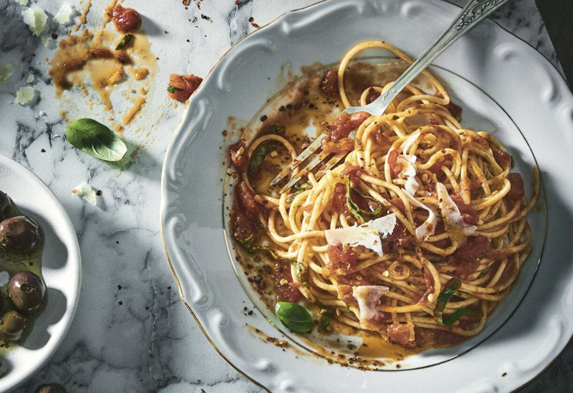 - Ρίχνουμε τις ντομάτες, τη ρίγανη, τη μισή ποσότητα βασιλικού και αλατοπίπερο και μαγειρεύουμε για περίπου 15 λεπτά, μέχρι να δέσει η σάλτσα.