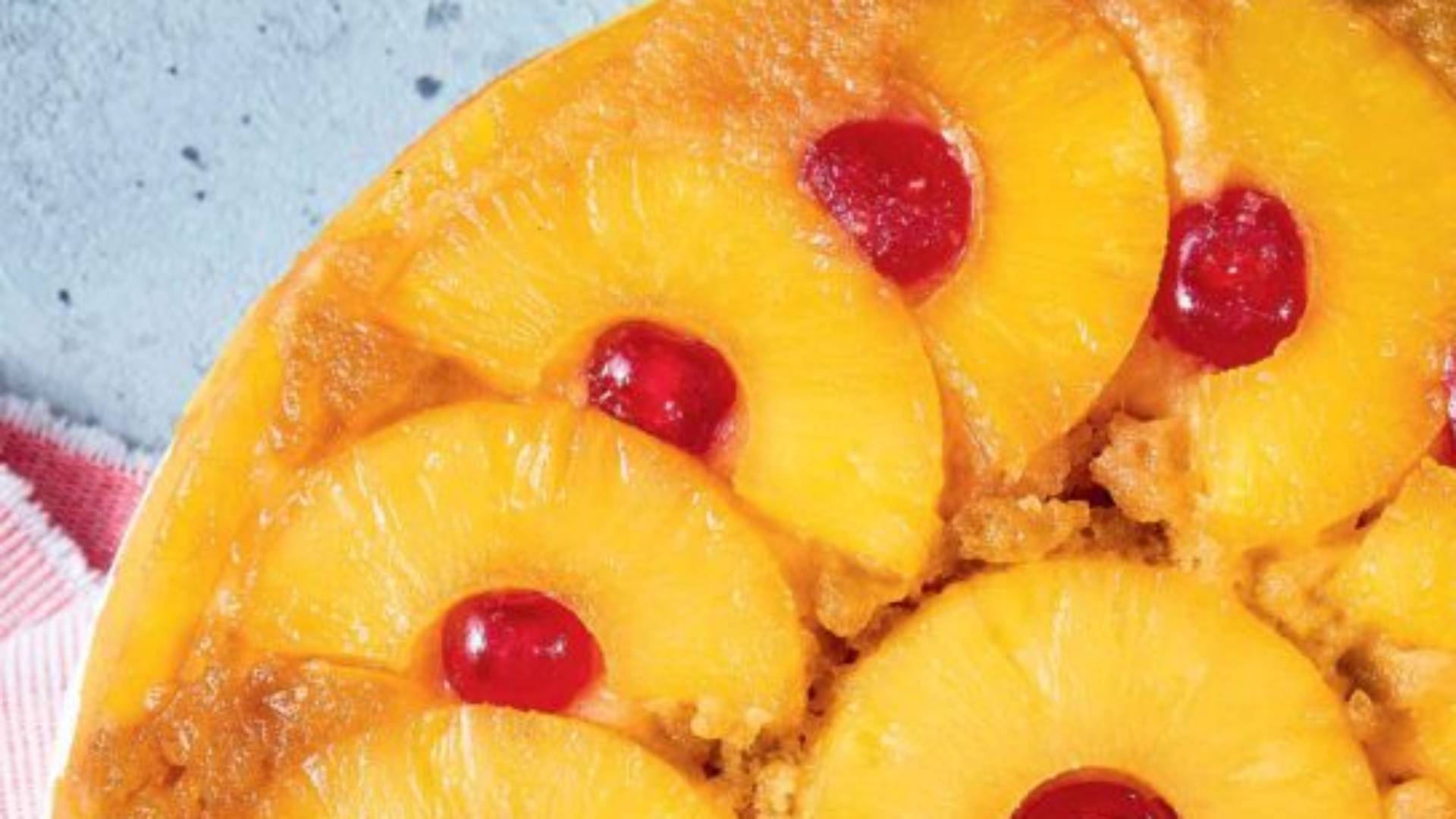 Εντυπωσιακό για να το σερβίρουμε ολόκληρο, αυτό το ανάποδο κέικ ανανά κλείνει το μάτι στο καλοκαίρι.