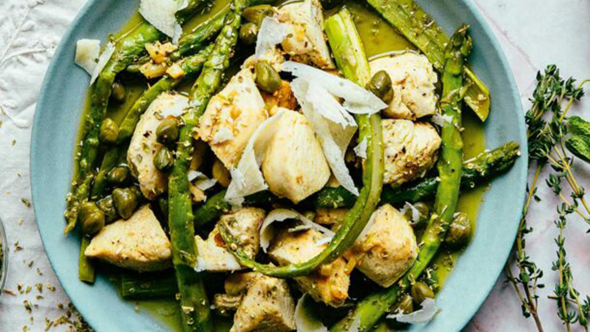 - Πασπαλίζουμε με την κεφαλογραβιέρα και σερβίρουμε την τηγανιά κοτόπουλου με σπαράγγια.