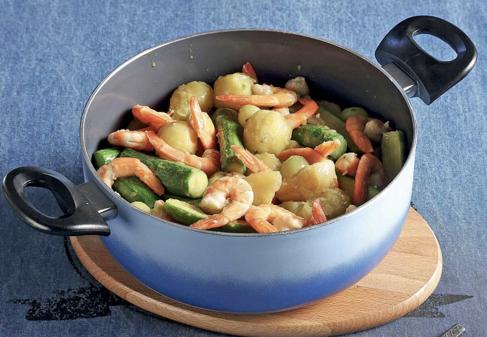 Μαγειρευτό φαγάκι, απλό αλλά με σπουδαία νοστιμιά από το ζωμό της γαρίδας. Τα κολοκυθάκια και οι πατάτες απορροφούν τη γεύση του θαλασσινού, σε ένα έξοχα ισορροπημένο συνδυασμό.