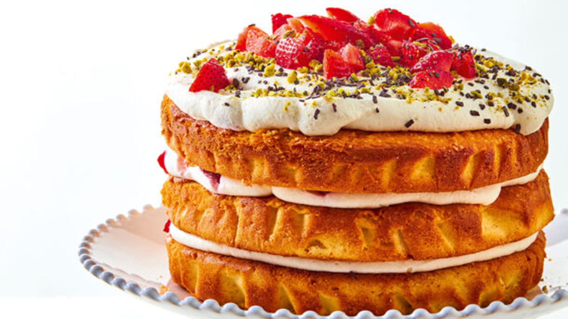 - Επαναλαμβάνουμε τη διαδικασία με το δεύτερο και το τρίτο κέικ, μοιράζοντας στο καθένα την υπόλοιπη κρέμα τυριού και τις υπόλοιπες φράουλες.