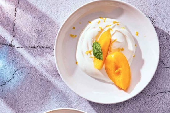 - Μοιράζουμε την κρέμα γιαουρτιού σε 4 μπολ ή βαθιά πιάτα. Κόβουμε στη μέση τα ροδάκινα και σερβίρουμε από μισό κομμάτι σε κάθε μερίδα, με λίγο από το σιρόπι τους και 1 φύλλο δυόσμου (αν θέλουμε).