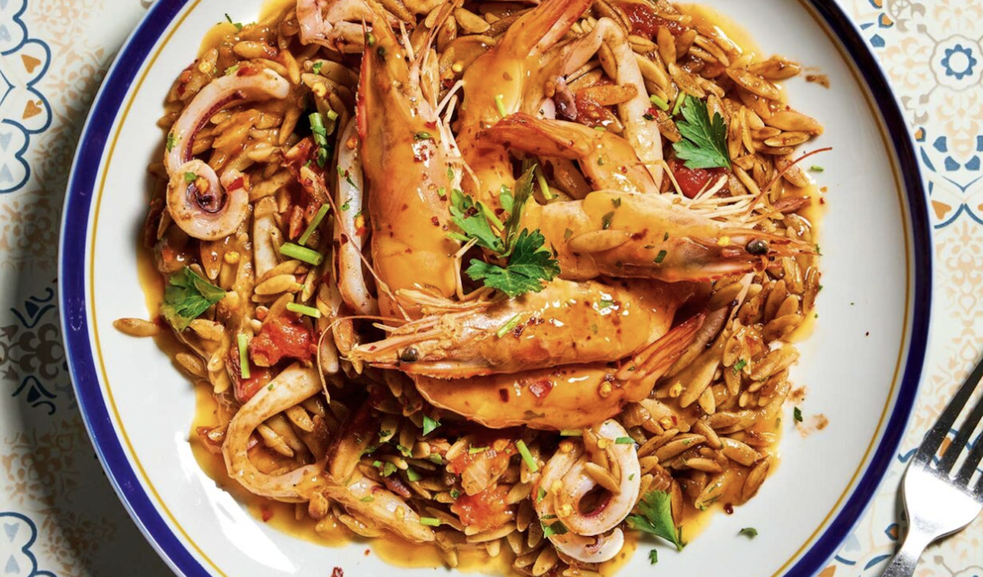 - Μοιράζουμε το κριθαράκι στο κέντρο καθενός από 6 πιάτα. Περιμετρικά τακτοποιούμε τις γαρίδες και σερβίρουμε αμέσως.