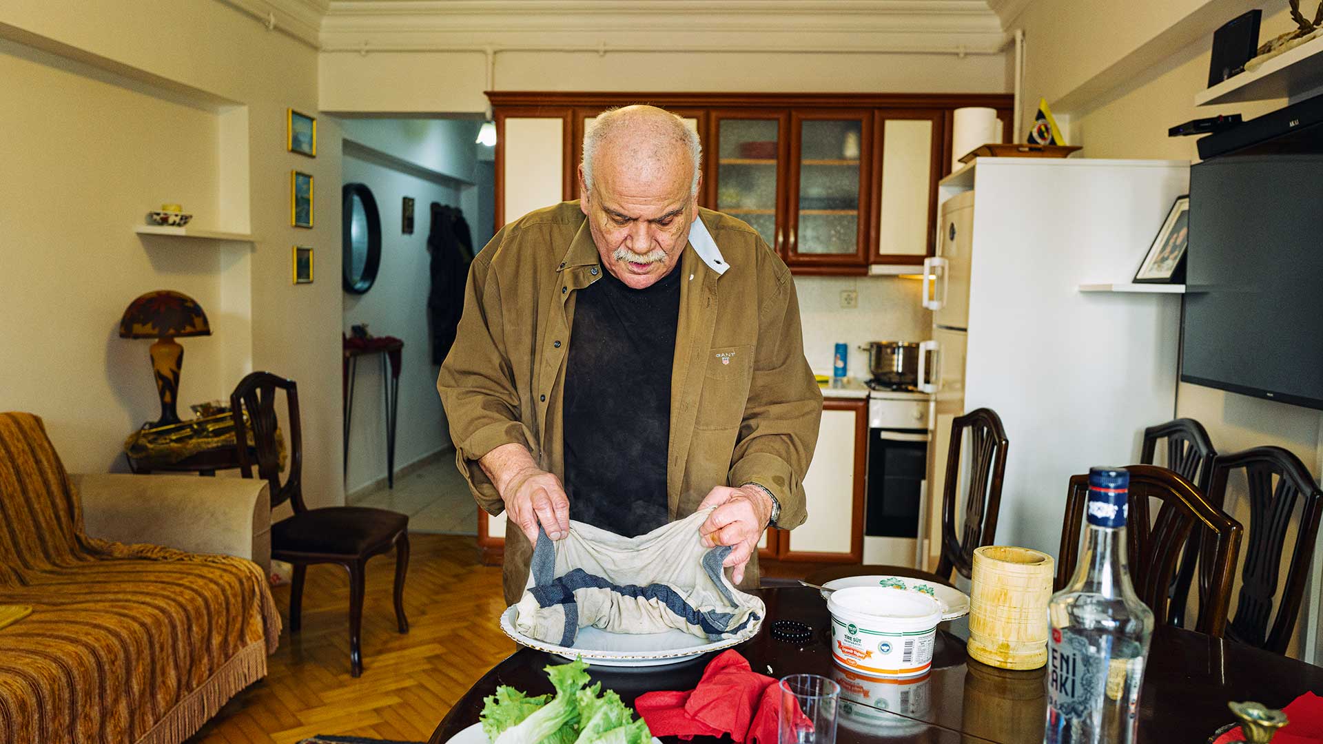 Όσο για το ψευτομαντί που μας σέρβιρε στη συνέχεια, τονίζει πως είναι η πιο εύκολη εκδοχή που προτιμούσαν οι Ρωμιές. «Η Πολίτισσα δεν καθόταν να ανοίξει φύλλο για μαντί ή για πίτες. Έπαιρνε ένα έτοιμο φύλλο γιουφκά και έφτιαχνε ένα μεγάλο μαντί, αντί για πολλά μικροσκοπικά», εξηγεί. Τα τακτοποιεί στο τραπέζι, μας κερνά ρακή και μας καλεί να τα δοκιμάσουμε. «Το ψευτομαντί τρώγεται ζεστό, το kadinbudu köfte κρύο. Κοπιάστε!».