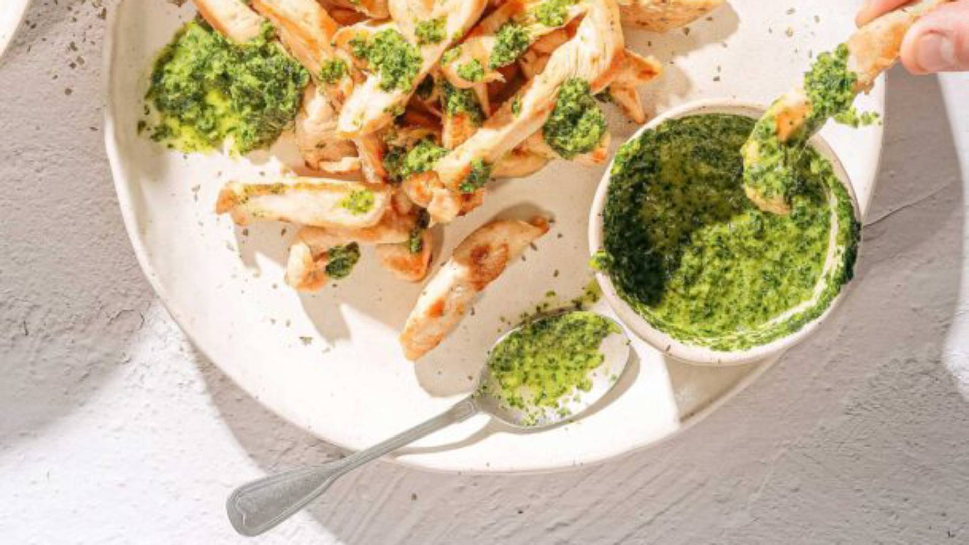 - Για να ετοιμάσουμε το φιλέτο κοτόπουλο με σάλτσα τσιμιτσούρι χτυπάμε όλα τα υλικά εκτός από το λεμόνι και το ελαιόλαδο στον πολυκόφτη.