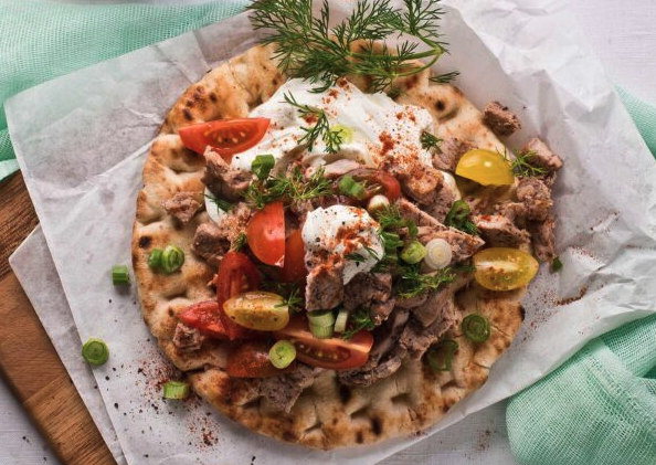 Γεμίζουμε την πίτα με τα υλικά από τη μέση και πάνω, όχι κοντά στην κάτω άκρη της πίτας, για να αποφύγουμε να τρέξει το ζουμί από το γιαούρτι και τα ντοματίνια.