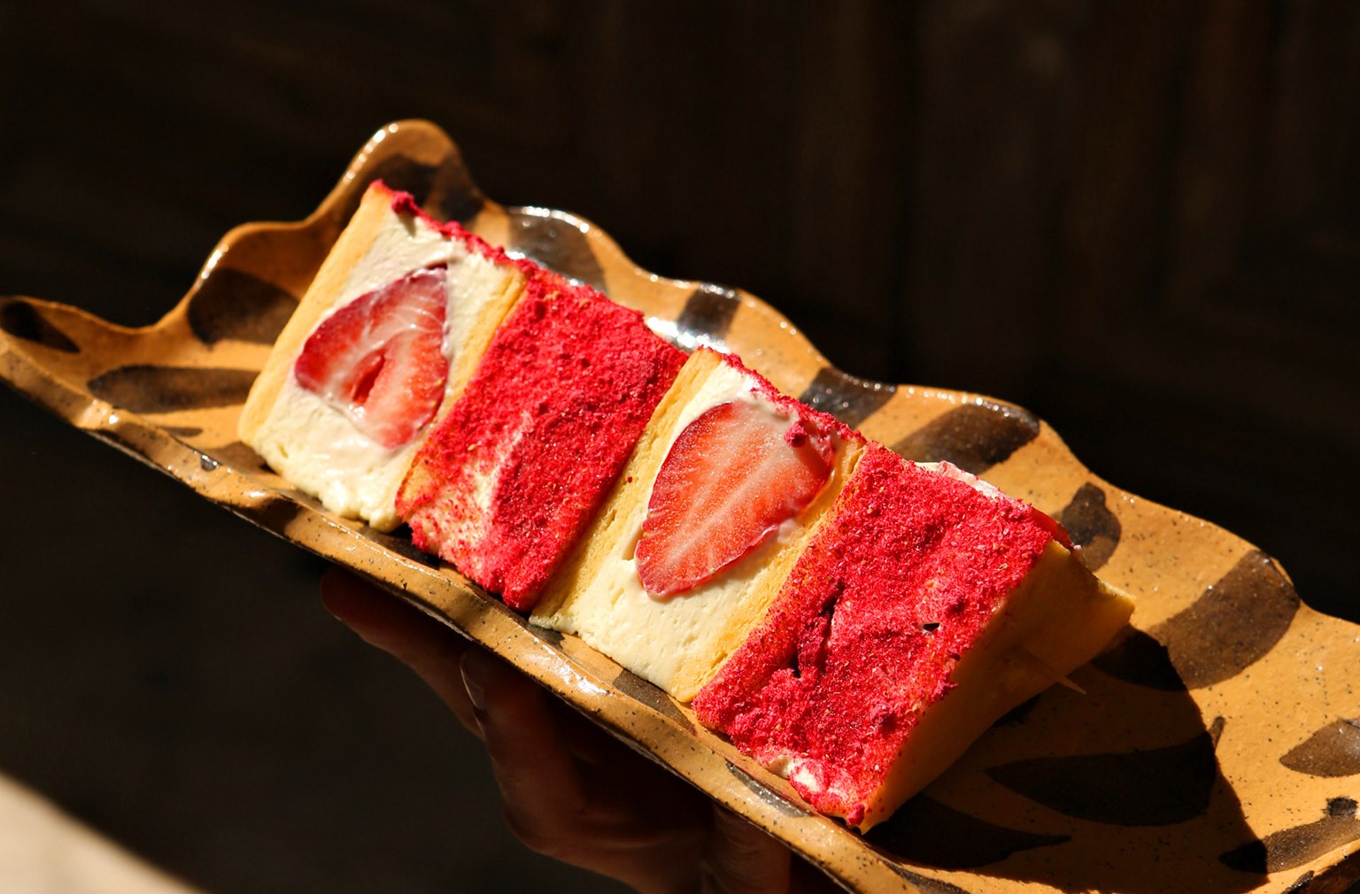 Μετά τα smash burger, τα ράμεν και τα sando (δοκιμάστε οπωσδήποτε το καινούργιο με πικάντικο ταρτάρ), κρατήστε λίγο χώρο για το γλυκό sando που έχει σκαρφιστεί ο Σταύρος Αμίτσης, ζαχαροπλάστης στο Ekiben. Οι στρώσεις του ζουμερού ψωμιού είναι πολύ λεπτές ώστε να μην βαραίνει το γλυκό και να μπορεί να φαγωθεί ως επιδόρπιο. Για γέμιση έχει ελαφριά κρέμα με τζίντζερ και λεμονόχορτο, φρέσκες φράουλες και φρέσκα μύρτιλα. Η ευχάριστη, ελαφρώς ξινούτσικη γεύση έρχεται από την σκόνη αποξηραμένου ράσμπερι στην οποία βουτιέται η μια πλευρά του σάντουιτς.