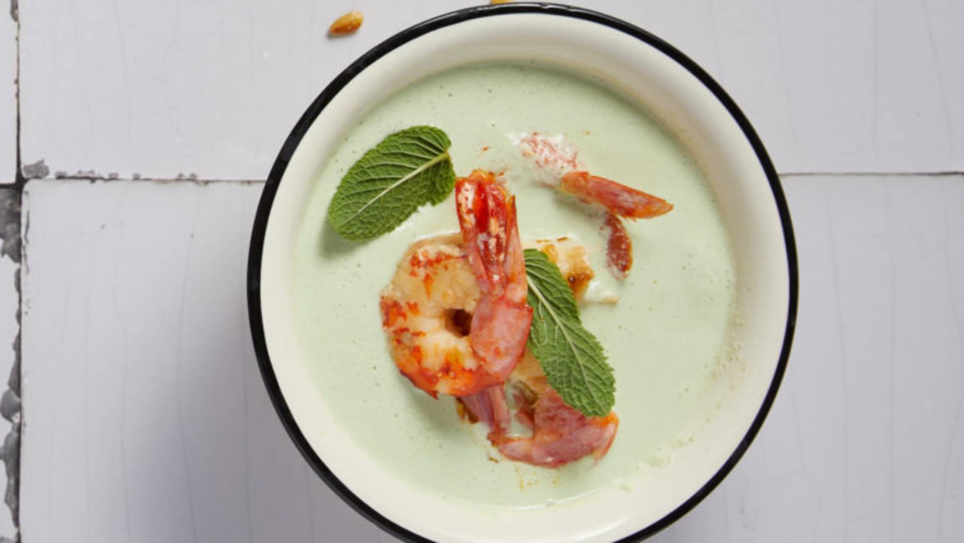- Μοιράζουμε τη σούπα σε ατομικά μπολ και μοιράζουμε από 3 γαρίδες και 1-2 φύλλα δυόσμου σε κάθε μπολ. Σερβίρουμε αμέσως.